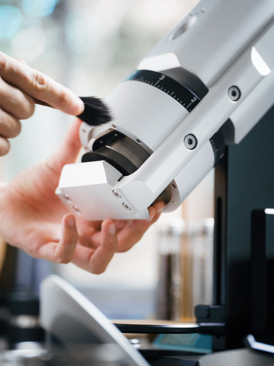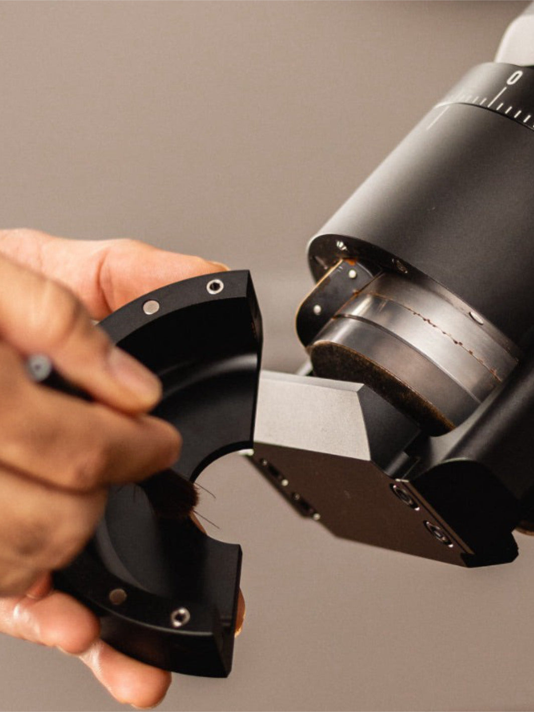 La chambre de mouture s’ouvre, se nettoie et se referme en environ 30 secondes. Les capuchons supérieur et inférieur forment une chambre « coquille » maintenue par des aimants en néodyme, offrant un accès complet aux meules et au système de raclettes.
