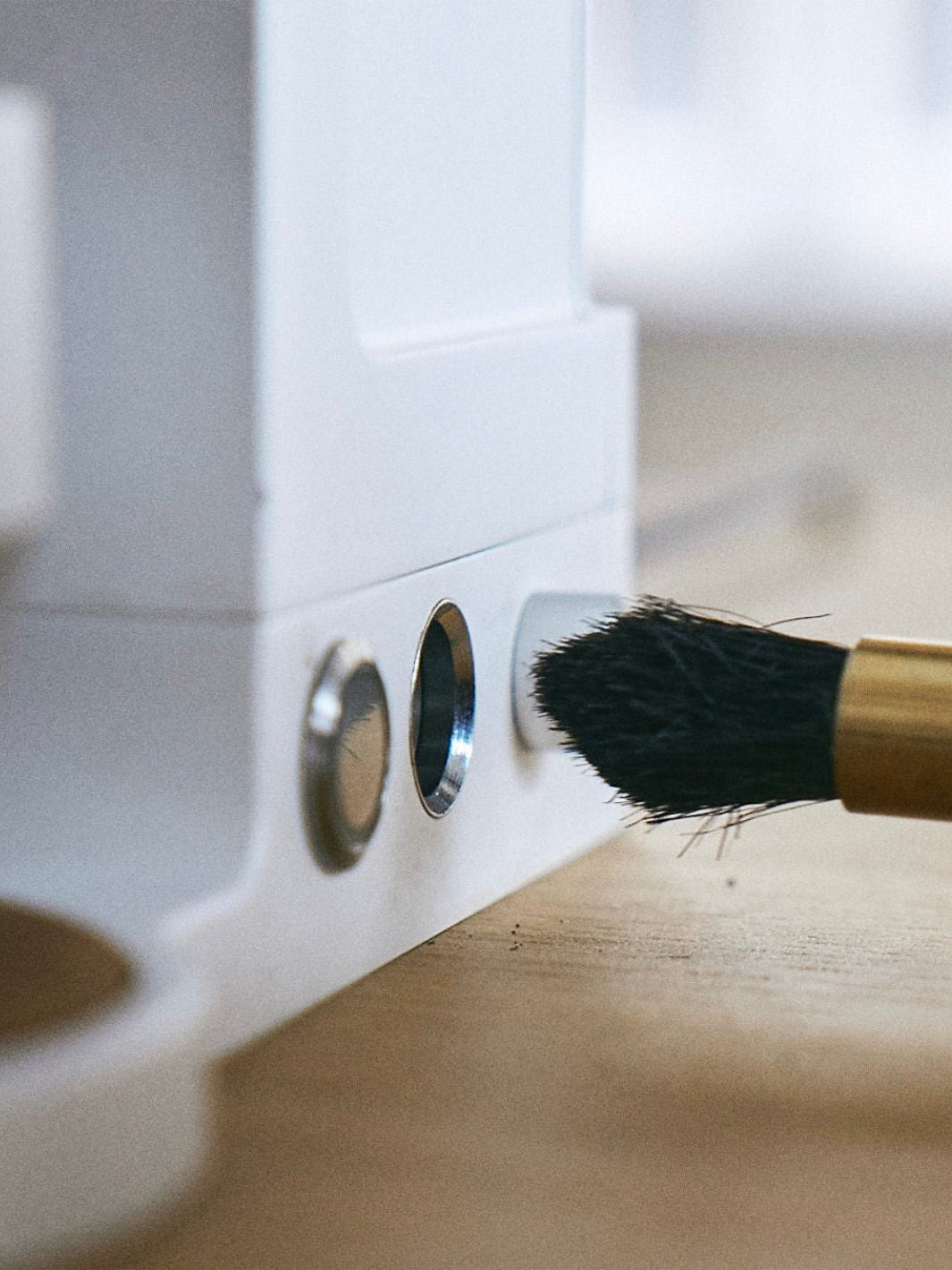 Poignée en chêne massif, virole en laiton et fixation magnétique cachée. La tête de brosse est remplaçable.