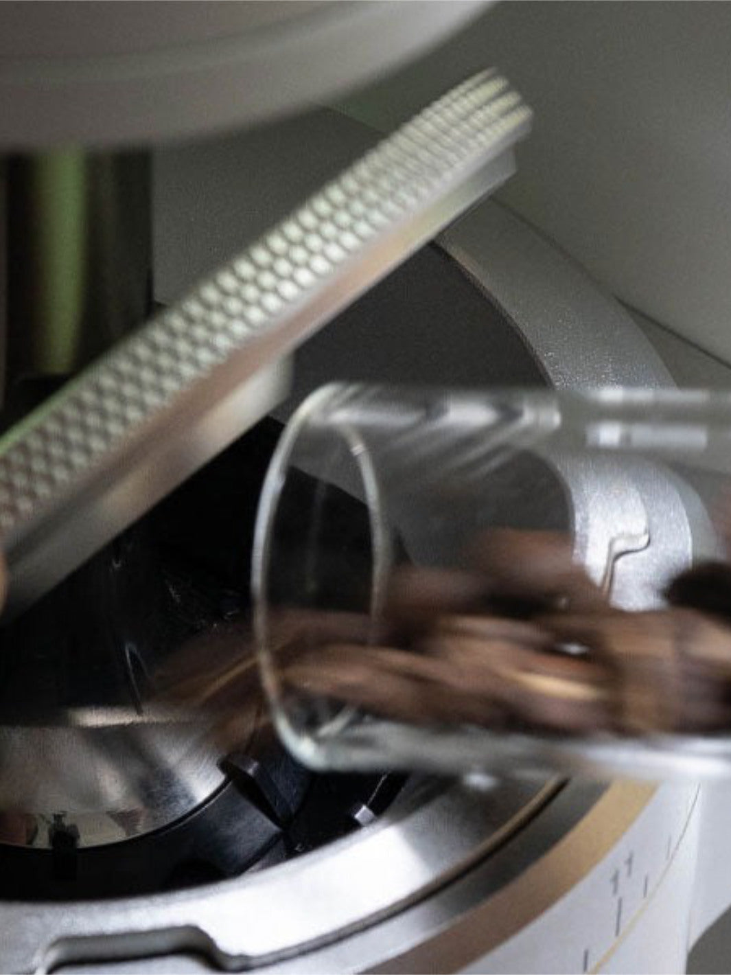 Mécanisme breveté pour une homogénéisation WDT automatique, sans débordement et compatible avec portafiltre 58 mm, Aeropress, Moka ou filtres pour pour-over.